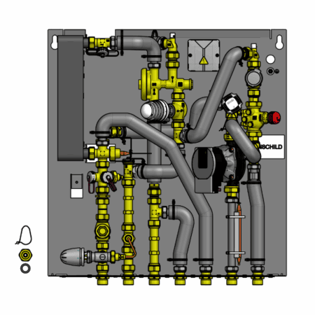 – zónový ventil s termopohonom (230 V / 50 Hz) na primárnej strane vykurovania pre možnosť riadenia nízkoteplotného vykurovania za stanicou pomocou regulátora priestorovej teploty
