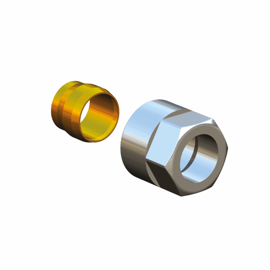 pre tenkostenné oceľové a medené rúry, svorkový krúžok kovovo tesniaci na rúru, matica so svorkovým krúžkom M 22 x 1,5, pochrómovaná. DN10, DN12 a DN14 nie sú vhodné pre pochrómované rúry a rúry z ušľachtilej ocele, tesnenie O-krúžkom. DN15 a DN16 sú určené pre rúrky z mäkkej ocele, medené a pochrómované rúrky, kovové tesnenie.