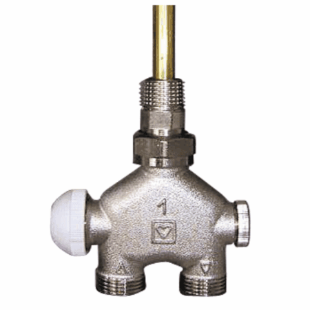 s termostatickým zvrškom TS-90 a pripojovacím závitom pre termostatickú hlavicu M 28 x 1,5. Umožňuje jednobodové pripojenie vykurovacieho telesa zdola v strede príp. bočne, s plochým tesnením, s ponornou rúrou dĺžky l = 150, resp 200 mm a priemeru 11 mm. Rozostup rúr 40 mm. Nastaviteľný pomer zatekania vykurovacej vody do telesa pri termostatickej prevádzke. Vykurovacie teleso je odnímateľné pod tlakom. Zvršok je vymeniteľný bez vypustenia sústavy (pod tlakom) pomocou zariadenia HERZ-Changefix. Prechodky G 3/4 sa objednávajú samostatne.