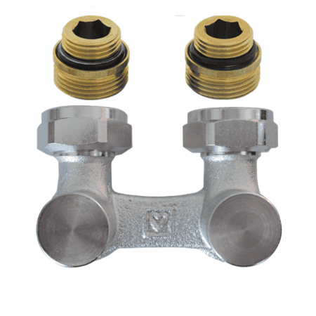 pre 2-rúrkové vykurovacie sústavy, s uzatváraním, osová vzdialenosť pripájacích hrdiel je 50 mm, pripojenie vykurovacieho telesa Rp 1/2 presuvnou maticou. Dve pripájacie vsuvky 1 3002 31 sú pribalené. Pripojenie rúrky vonkajším závitom G 3/4 s kužeľovým tesnením pre prechodku (objednávať samostatne). Vhodné pre vykur. telesá napr.: Purmo, Korado, US-Steel Korad.