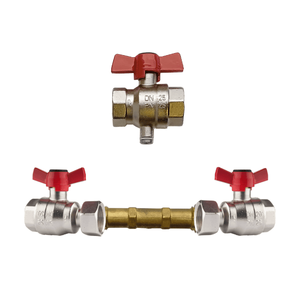 2 ks – Guľový kohút DN20 s obj. číslom 1 2221 02 s vonkajšou maticou G 3/4″ a motýlikovým ovládačom, pripojenie: vnútorný závit G 3/4″ x prevlečná matica G 3/4″