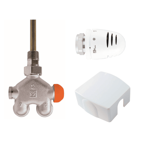 1. HERZ – VUA-40 Štvorcestný ventil pre 2-rúrové sústavy, rohový, s prednastaviteľným termostatickým zvrškom TS-98-V a pripojovacím závitom pre termostatickú hlavicu M28x1,5. Pripojenie vykurovacieho telesa zdola v strede / bočne, s plochým tesnením, rozostup rúr 40 mm, s ponornou rúrou dĺžky l = 150 mm a priemeru 11 mm, vykurovacie teleso odnímateľné pod tlakom, zvršok je vymeniteľný pomocou HERZ-Changefix bez vypustenia sústavy. Prechodky G 3/4 sa objednávajú samostatne. G 3/4