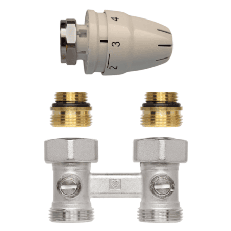 1. HERZ -pripájací diel HERZ-3000 SET, priamy, s možnosťou uzatvorenia, osová vzdialenosť pripájacích hrdiel je 50 mm, uzatváranie pomocou dvoch guľových kohútov, pripojenie vykurovacieho telesa Rp 1/2 vonkajším závitom, pripojenie rúry G 3/4 vonkajším závitom s kužeľovým tesnením pre prechodku (objednávať samostatne), 2 vsuvky 1 3002 31 sú pribalené. Vhodné pre vykurovacie telesá napr.: Purmo, Korado, US-Steel Korad.