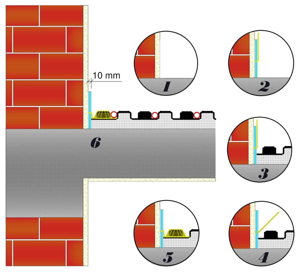Obvodový dilatačný pás – kompenzuje tepelnú rozťažnosť pri podlahovom vykurovaní a zabraňuje prenosu hluku medzi stenou a podlahou.